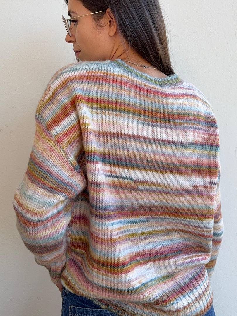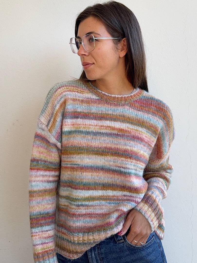a girocollo, realizzato con filato morbido e multicolor